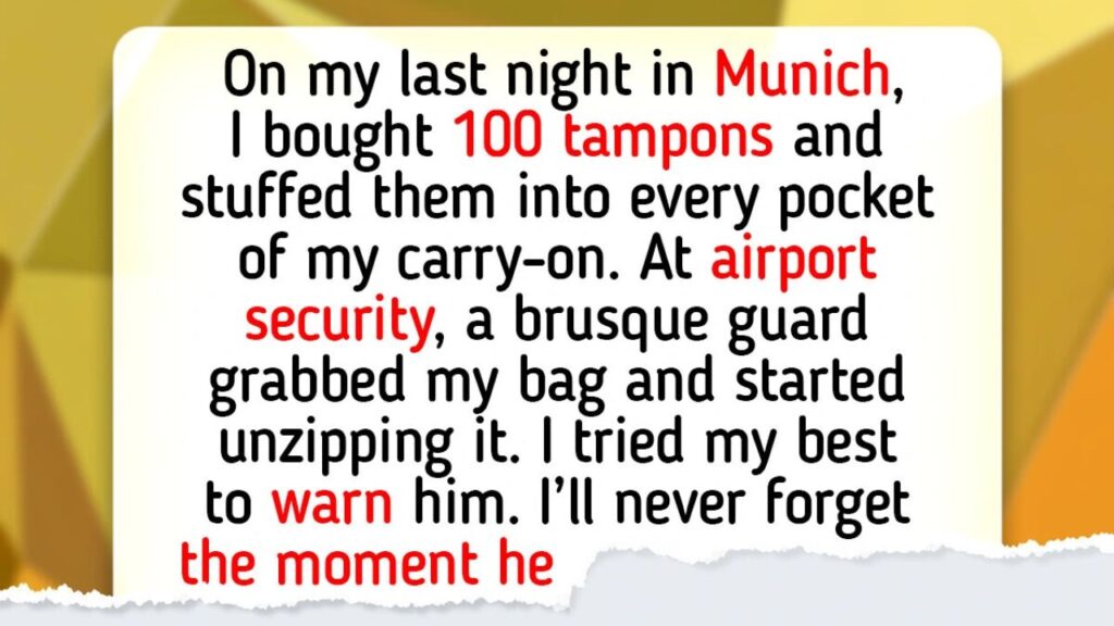 With dramatic force, he yanked the zipper open while holding the bag in the air. Instantly, dozens of tampons flew everywhere like tiny white bullets. They landed on the floor, on nearby travelers, and all over the security area.