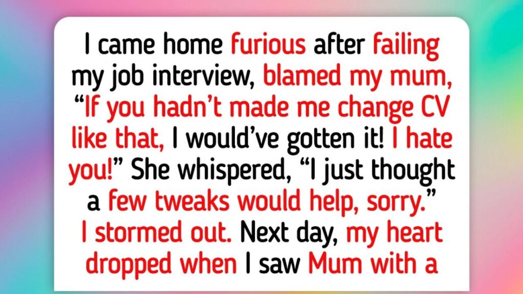 After losing my first real job interview, I came home furious and blamed my mom for it. I shouted that it was her fault because she had suggested changes to my CV and that I hated her for interfering.