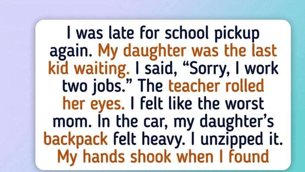 I was late for school pickup again. My daughter was the last kid waiting. I said, “Sorry, I work two jobs.” The teacher rolled her eyes. I felt like the worst mom. In the car, my daughter’s backpack felt heavy. I unzipped it. My hands shook when I found a letter addressed to the Principal from the teacher I thought hated me. It was a glowing recommendation for a full-ride community scholarship, citing my “unmatched dedication” as the reason my daughter was the top student in class. The teacher wasn’t rolling her eyes at my lateness; she was rolling them at the “perfect” moms who had been complaining that I was “bringing down the school’s image” by working two jobs.